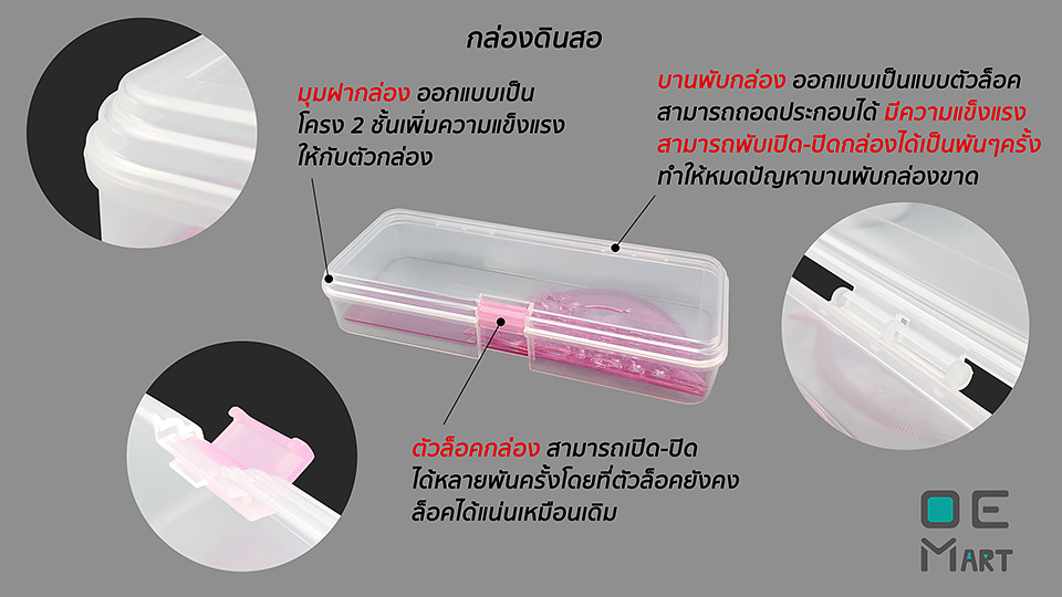 นอกจากเรื่องดีไซน์รูปลักษณ์ภายนอกที่สวยงามแล้ว ตัวกล่องยังมีความแข็งแรงทนทานไม่แตกหรือพังง่ายๆ เพราะผลิตจากพลาสติก PP คุณภาพสูง และตัวฝากล่องถูกออกแบบให้มีโครงถึง 2 ชั้น ซึ่งช่วยเพิ่มความแข็งแรงให้กับกล่องได้เป็นอย่างดี ส่วนตัวล็อคกล่องกับบานพับนั้นก็มีความแข็งแรงไม่แพ้ตัวกล่องเลย กล่องดินสอทั่วไปโดยส่วนใหญ่บานพับของกล่องกับตัวล็อคนั้นจะพังง่ายมากใช้งานได้ไม่เท่าไหร่บานพับกล่องก็ขาดออกจากกันซะแล้ว ส่วนตัวล็อคเมื่อใช้ไปซักพักก็เริ่มล็อคไม่แน่น ทำให้เครื่องเขียนหกและอยู่กระจัดกระจาดเต็มกระเป๋าไปหมด…ไม่อยู่ในกล่องเลย ดึงนั้นเราจึงได้ออกแบบบานพับและตัวล็อคของกล่องดินสอ oddeven แบบพิเศษให้ทนต่อการใช้งาน โดยตัวเขี้ยวล็อคของกล่องถูกออกแบบมาให้มีความแข็งแรงสามารถเปิด-ปิดได้หลายพันครั้งโดยไม่หลวม ส่วนบานพับกล่องนั้นเราดีไซน์บานพับเป็นแบบเขี้ยวล็อค ซึ่งสามารถถอดประกอบได้จึงหมดปัญหาเรื่องบานพับขาดแล้วกล่องใช้งานไม่ได้ เมื่อเราทำกล่องตกแล้วฝากับกล่องหลุดออกจากกันเราก็สามารถประกอบมันกลับเข้าไปได้ นอกจากนี้ตัวบานพับยังสามารถพับเปิด-ปิดได้หลายพันครั้งหรือจะถอดฝากล่องเข้า-ออกบ่อยๆตัวล็อคก็ยังคงล็อคได้ดีไม่หลวม สามารถใช้งานได้ยาวๆไปเลย